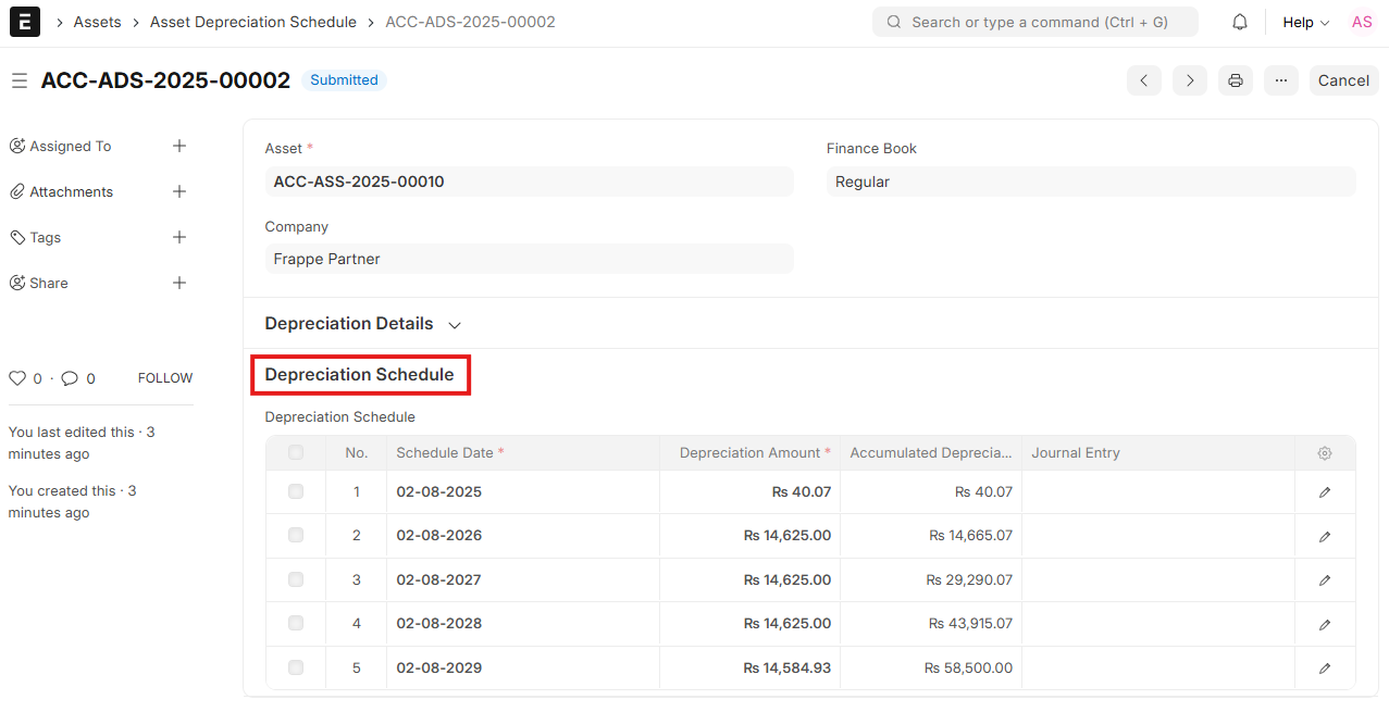 As soon as depreciation is configured and begins to get applied against an asset, ERPNext generates a Depreciation Schedule for the asset automatically. This is made available in the section within the Asset record once initial depreciation entries are booked.