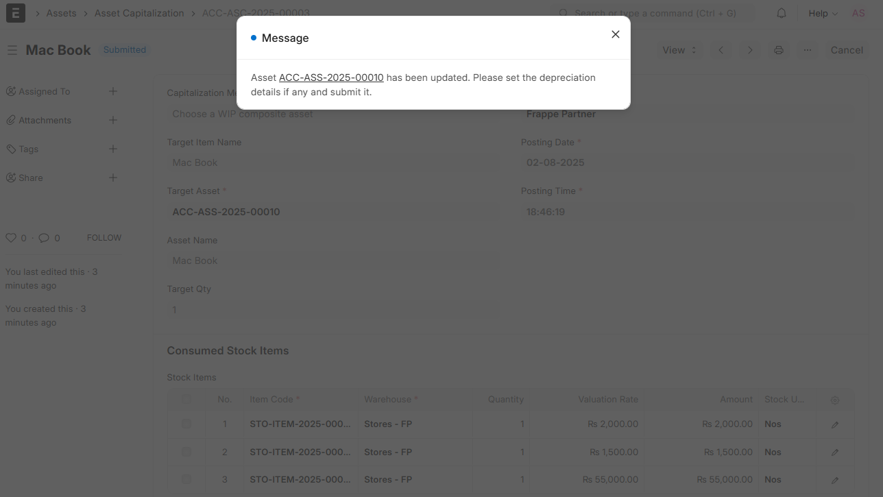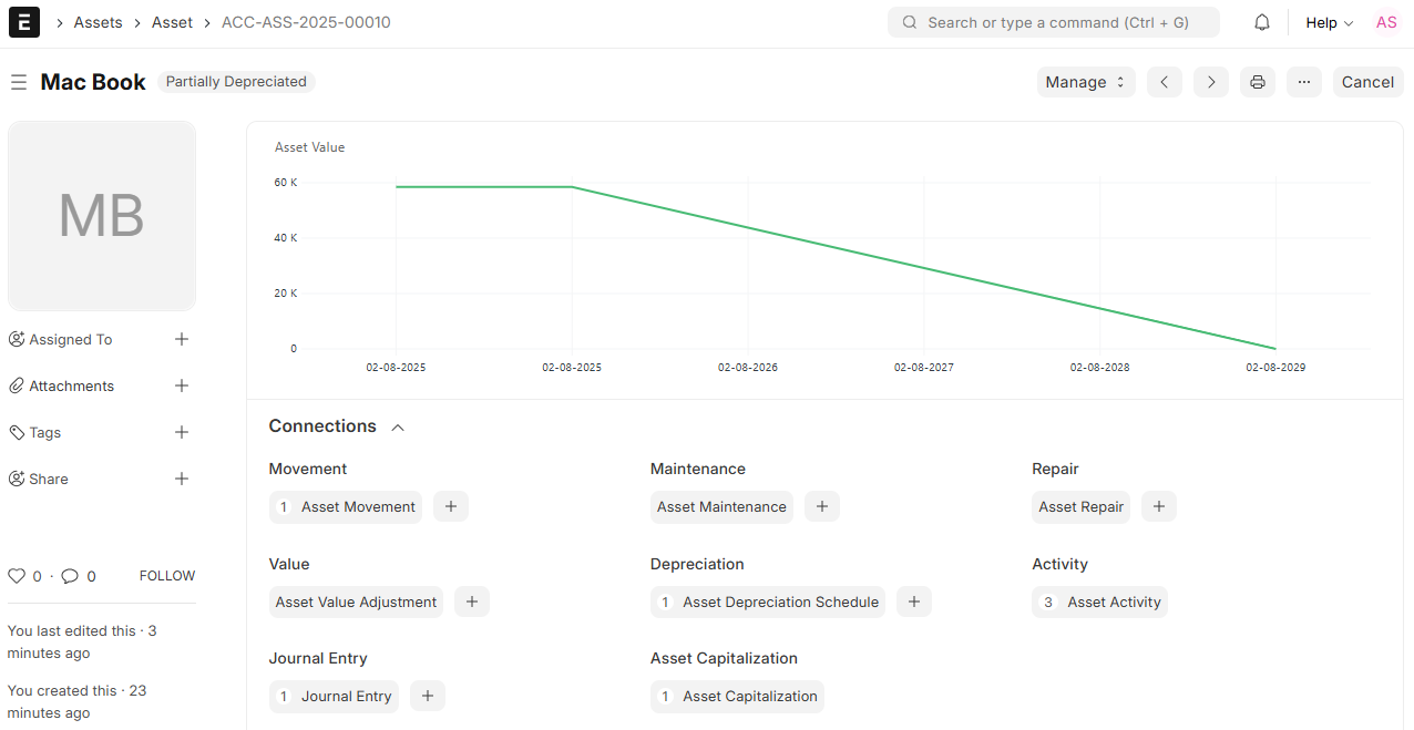 Once this is inputted and pressed to submit the asset, ERPNext will: