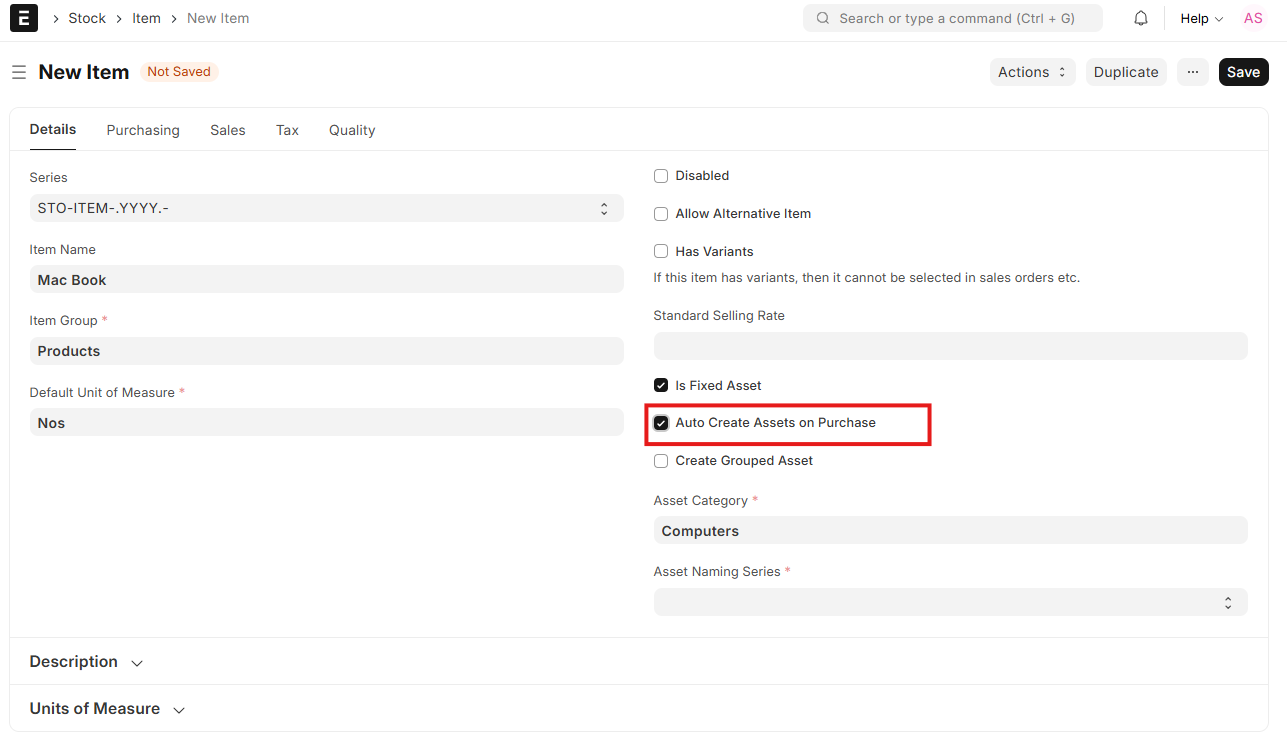 To enable this feature, you must enable the option ‘Auto Create Assets on Purchase’ in the Item master of the asset. This way, ERPNext will create an associated Asset record automatically from the transaction information every time this item is received through a Purchase Receipt.