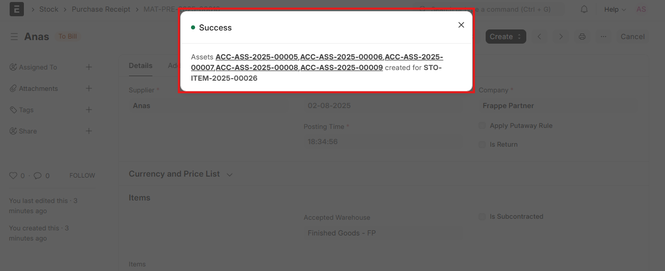After being successfully posted the Purchase Receipt, ERPNext will display a successful message that the asset(s) have been created.