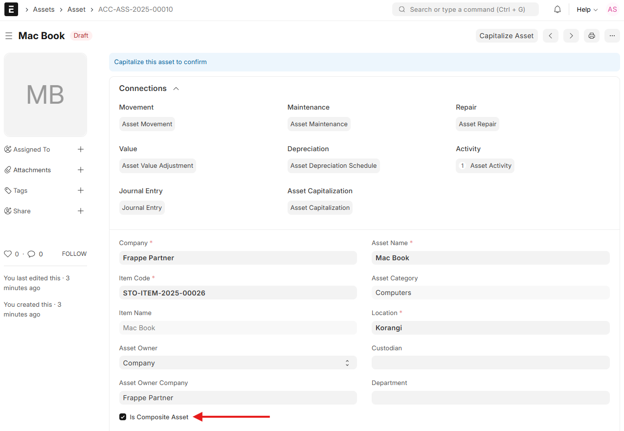 4. Once you have all necessary items/components and have the asset ready for use, you can capitalize the composite asset with the assistance of the Asset Capitalization feature. This will:
