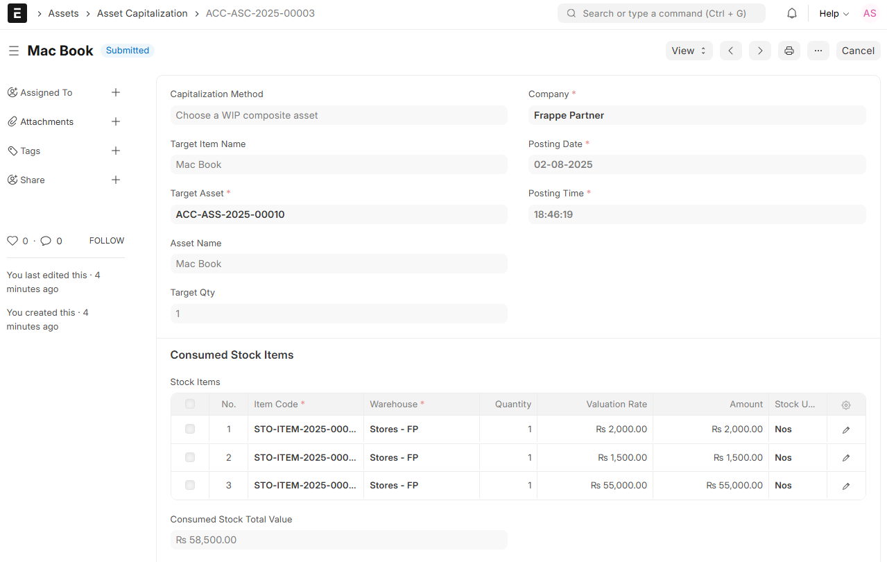 • When an asset is submitted, ERPNext creates a journal entry that credits the “Capital Work in Progress (CWIP)” account and debts the concerned Fixed Asset account, technically capitalizing the asset.