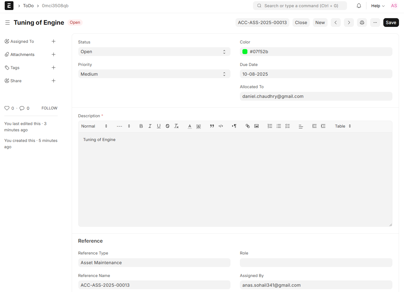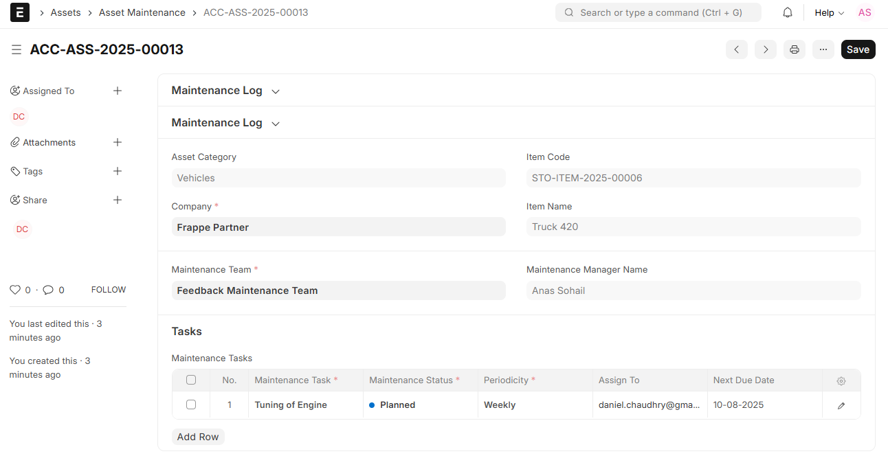 When maintenance work is assigned to someone the ERPNext creates a ToDo entry in the dashboard of a person automatically. It assists in reminding users at the right time, enhancing job visibility, and effortless tracking of pending maintenance jobs.