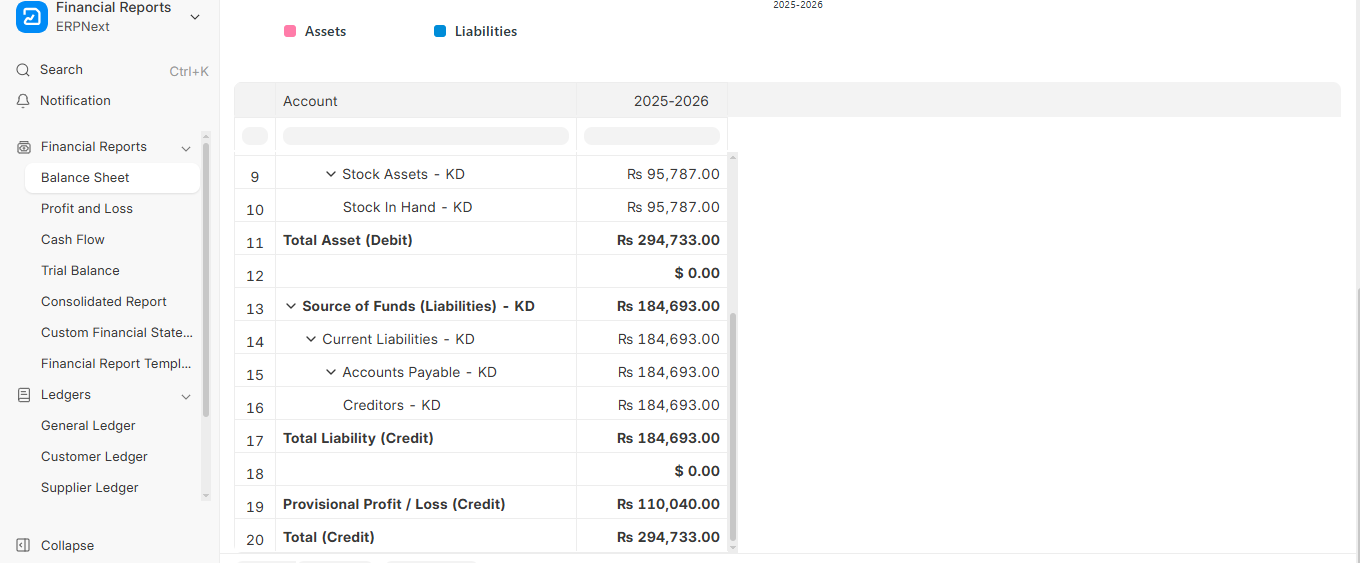 3. Balance Sheet Report: This is like a checkup for your business. It shows your company’s assets (money, property, or equipment) and liabilities (loans or obligations that are still owed) as of a certain date. It lets you figure out how much your business is worth and how stable its finances using ERPNext account types full list.