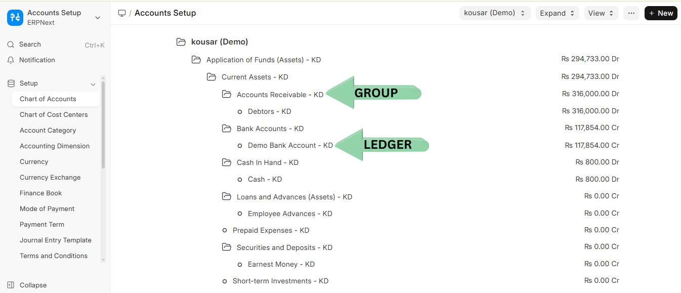 Group and Ledger accounts are the two primary types of accounts in ERPNext. While ledgers are the leaf nodes of your chart and cannot have more accounts in them, groups can have subgroups and ledgers within them. Only ledger accounts, not groups, may be the subject of accounting transactions.