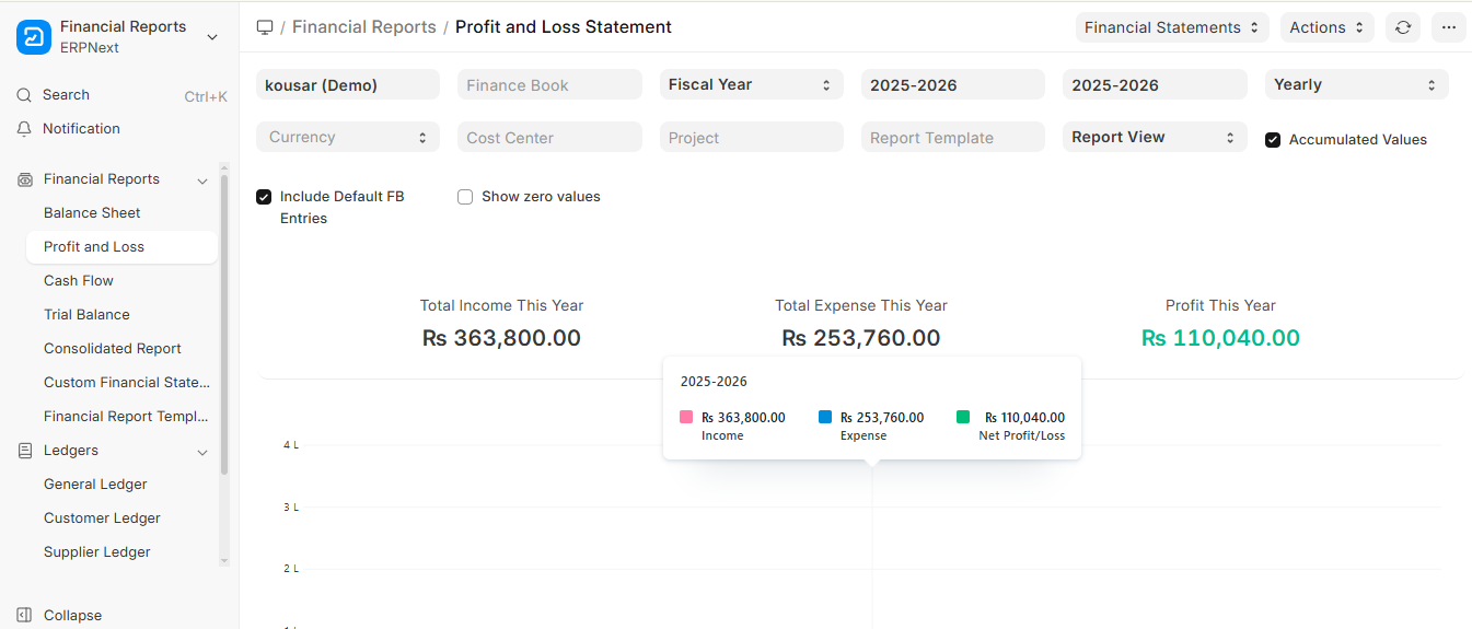 You don’t need to do any calculations yourself because ERPNext provides you with a profit and loss report, making this incredibly simple. You only need to choose the time frame to see your earnings and expenses.