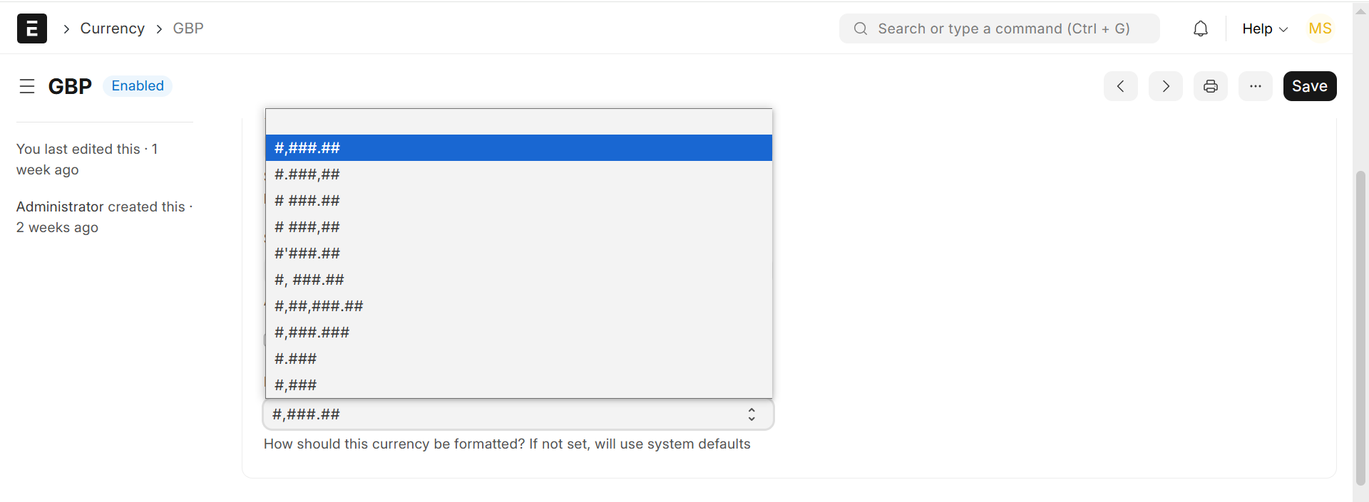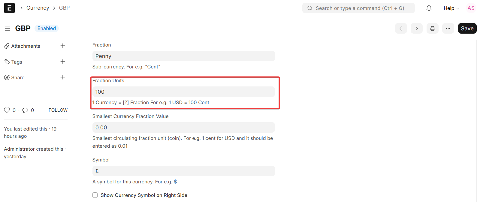 Each currency has default values following internationally accepted standards (such as symbol, fraction, number format). These, however, can be adjusted according to your business needs. For instance, GBP might be set with ‘Penny’ as the fraction and ‘£’ as the symbol, but you can rename the fraction to some custom value if required.