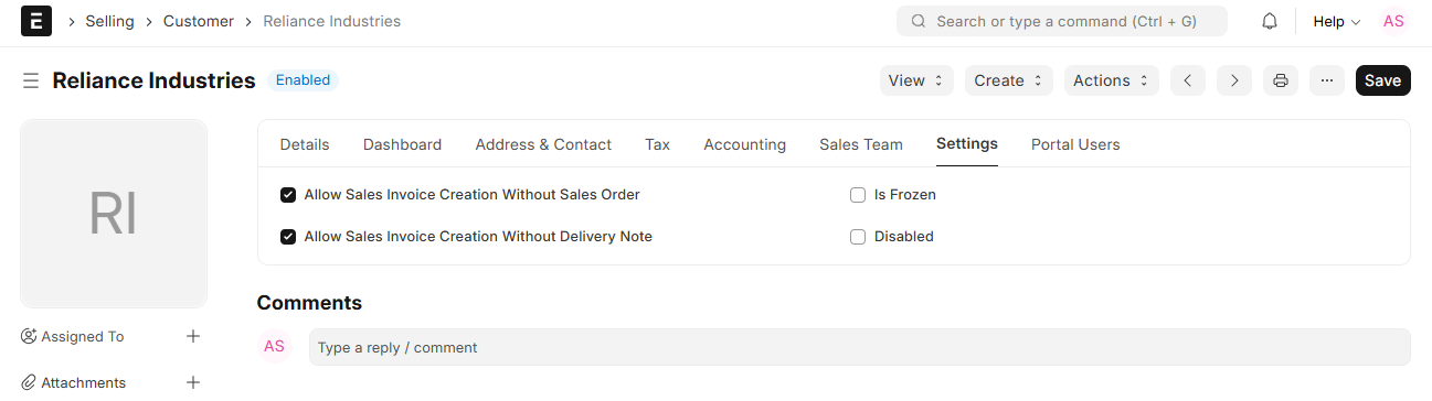- Billing Currency: Default currency is to be selected, in which quotations, sales orders and bills against this customer will be done.