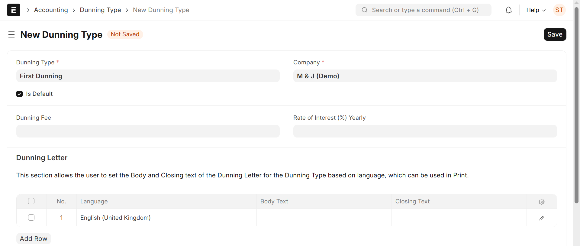 • Dunning Type: Employed for automatically populating interest rates, charges, and blocks of text when producing a new Dunning.