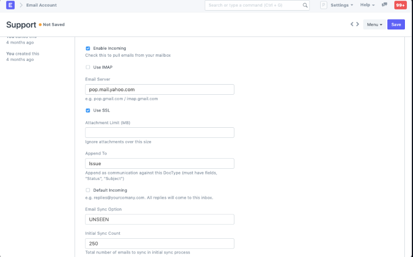 • First Sync Count: It tells ERPNext how many old emails to get during the first sync. This helps keep things from getting too busy during the first setup.
