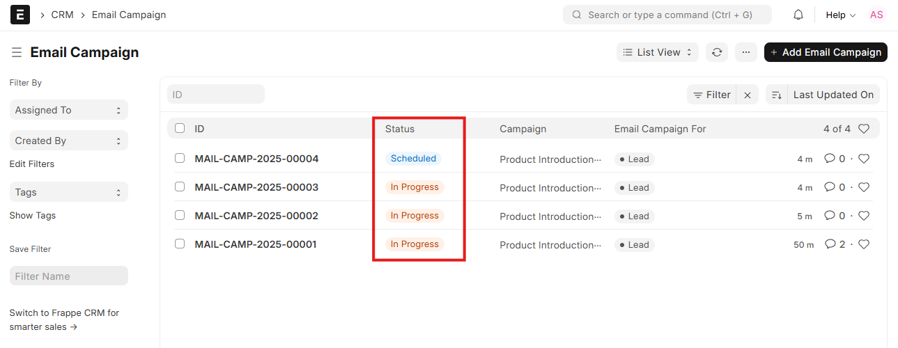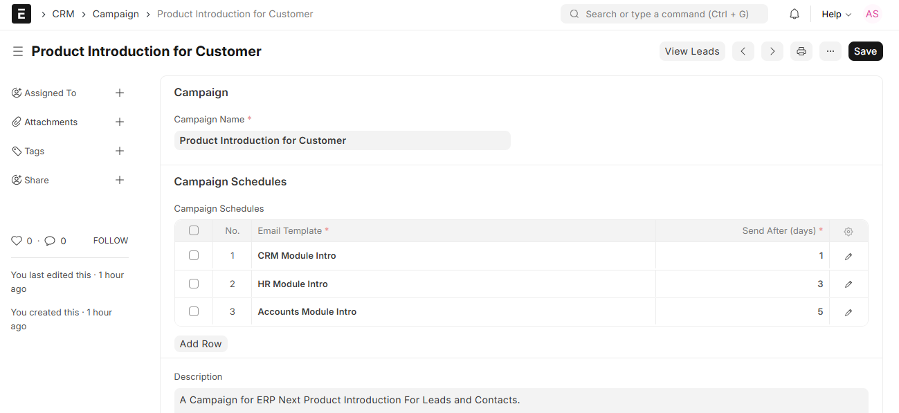 An Email Campaign in ERPNext is a controlled and automated set of emails that are sent to pre-identified recipients like Leads, Contacts, or Email Groups based on a pre-specified schedule.