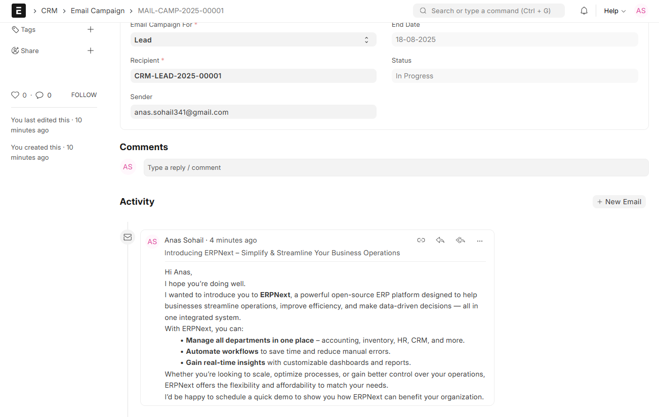 When emails are sent out to the corresponding Leads or Contacts as part of an Email Campaign, ERPNext does it automatically and records them as linked Communications on the Email Campaign document. This way, you can see the entire history of all dispatched messages, monitor delivery, and make sure that recipients are seeing the right content—all from one place.