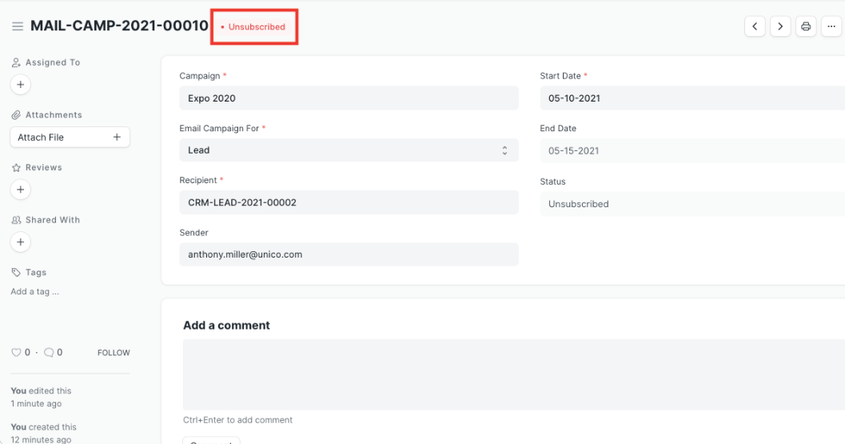 Every email that is sent via an Email Campaign has an unsubscribe link. When a Lead, Contact, or Email Group member clicks this link, they are automatically set as unsubscribed within the system and the Email Campaign’s status for the recipient is changed to Unsubscribed.