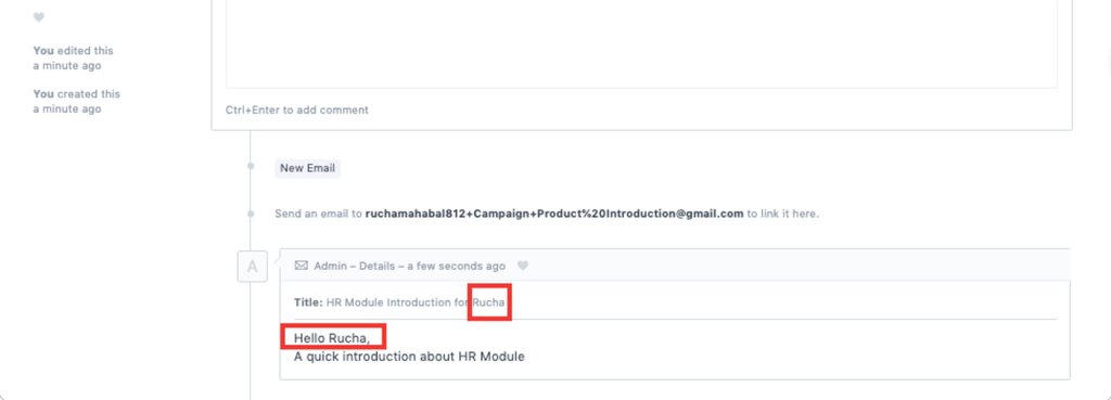 • When Email Campaign For is Contact, typing “doc.first_name” within the template will show the actual first name of each recipient.