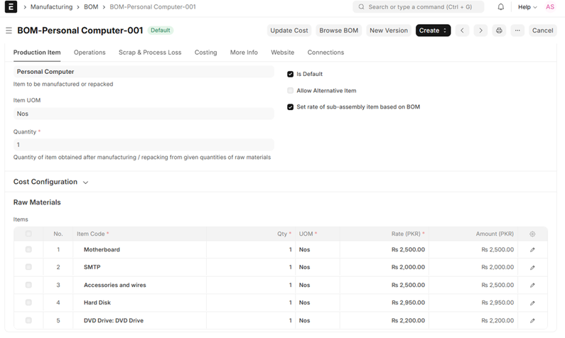 For instance, when producing a Personal Computer, the system enables you to create a multi-level or nested BOM to manage the different components and their sub-assemblies: