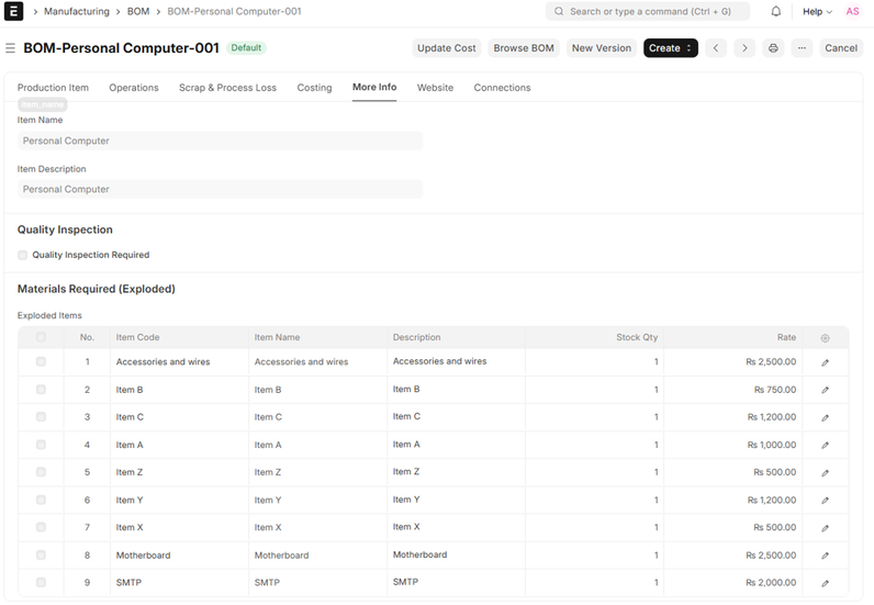 The ‘Materials’ table of the Personal Computer’s BOM will have components such as the Hard Disk and DVD Drive (i.e., sub-assemblies) only, whereas the ‘Materials Required (Exploded)’ table will have all raw materials from every level, e.g., Item A, B, C, X, Y, and Z. The exploded view gives a full breakdown of all materials to be used in manufacturing the FG item.