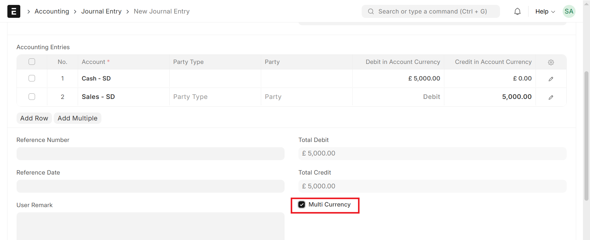 Enabling the “Multi Currency” checkbox in ERPNext allows you to manually create multi-currency accounting entries through a Journal Entry. You can choose accounts that are set in currencies other than the company’s base currency once this option is checked in ERPNext.