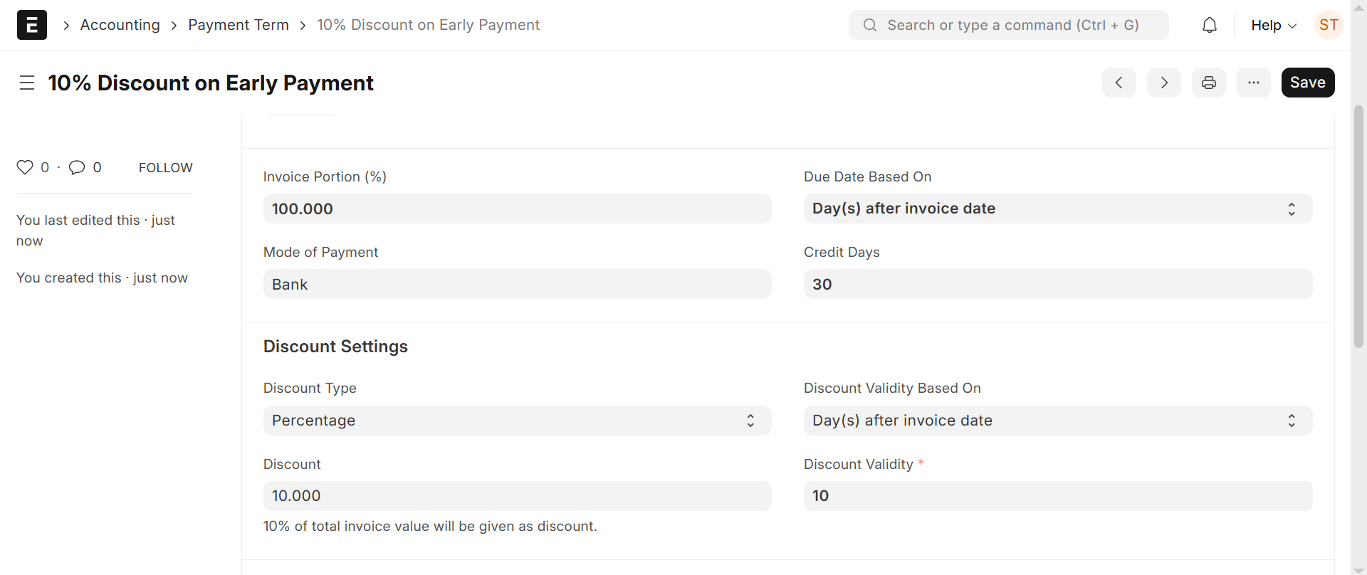 • Discount Type: Discount Type allows you to specify if the early payment discount will be in percentage or in amount. Percentage is the default, but if required, you can change it to amount.