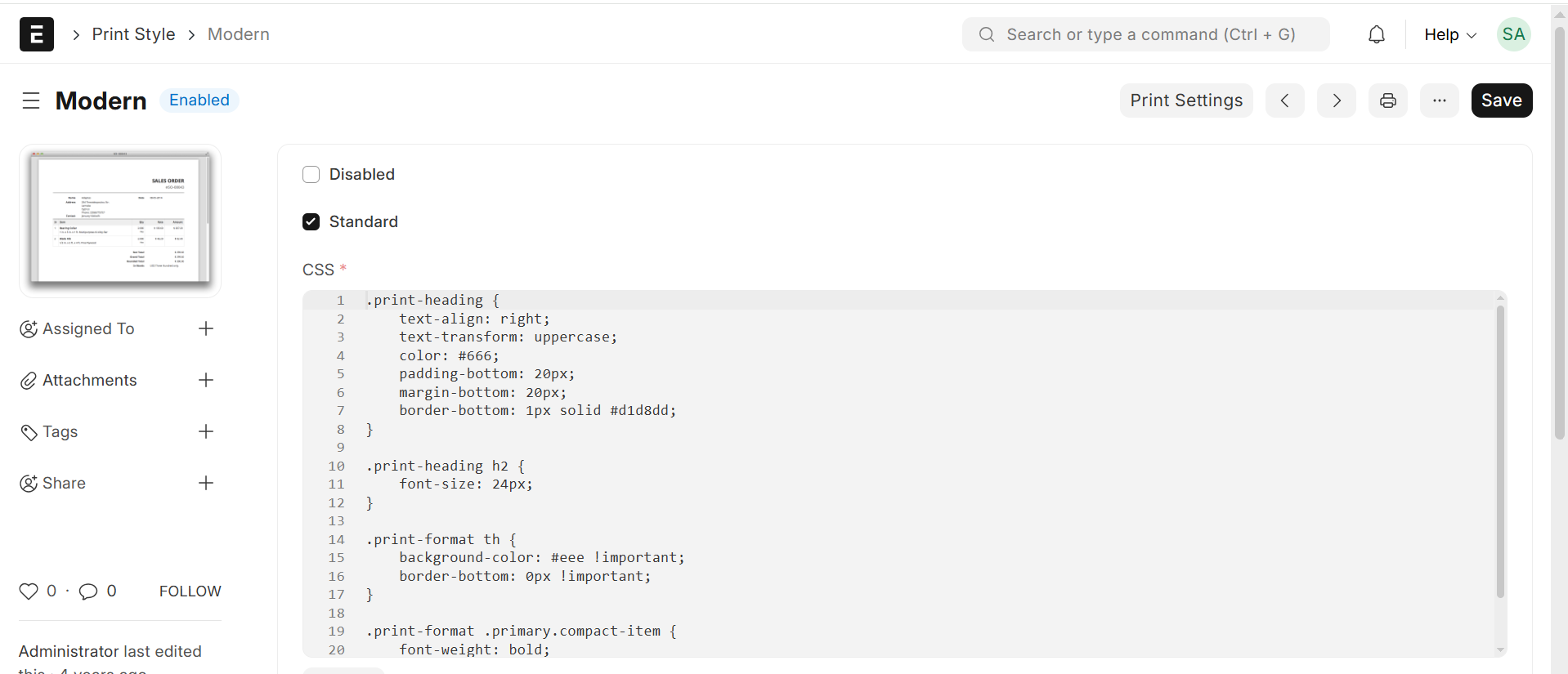 “Print Style” lets you make your own CSS styles that can be used with Print Formats in ERPNext. This gives you more control over how documents look when they are printed or saved as PDFs.