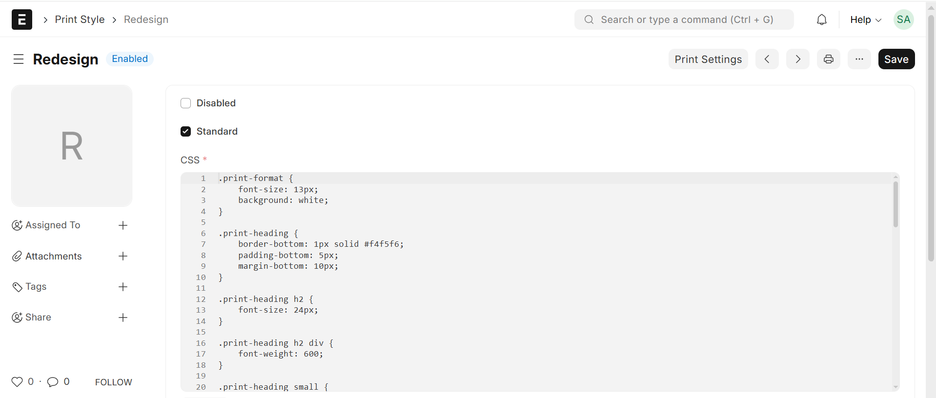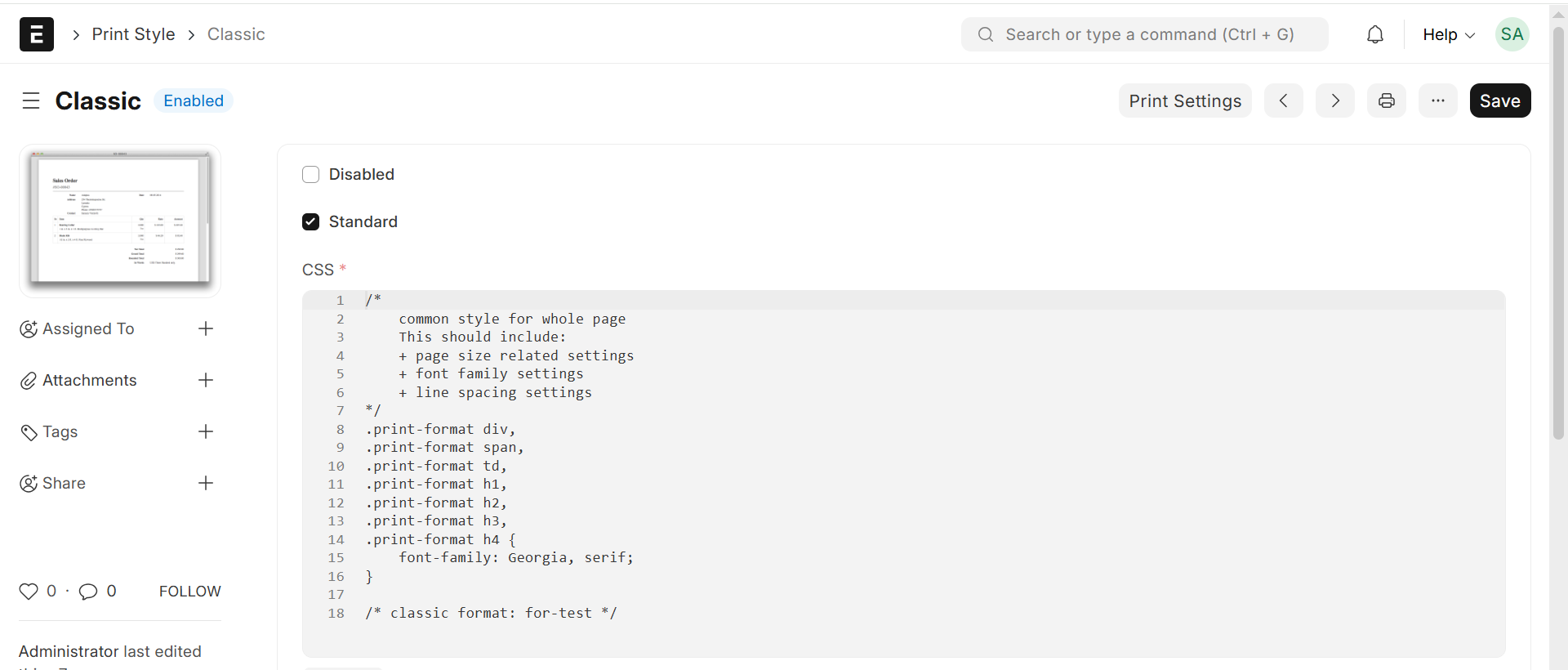 Home > Settings > Print Style
