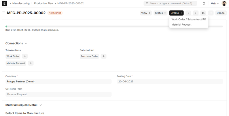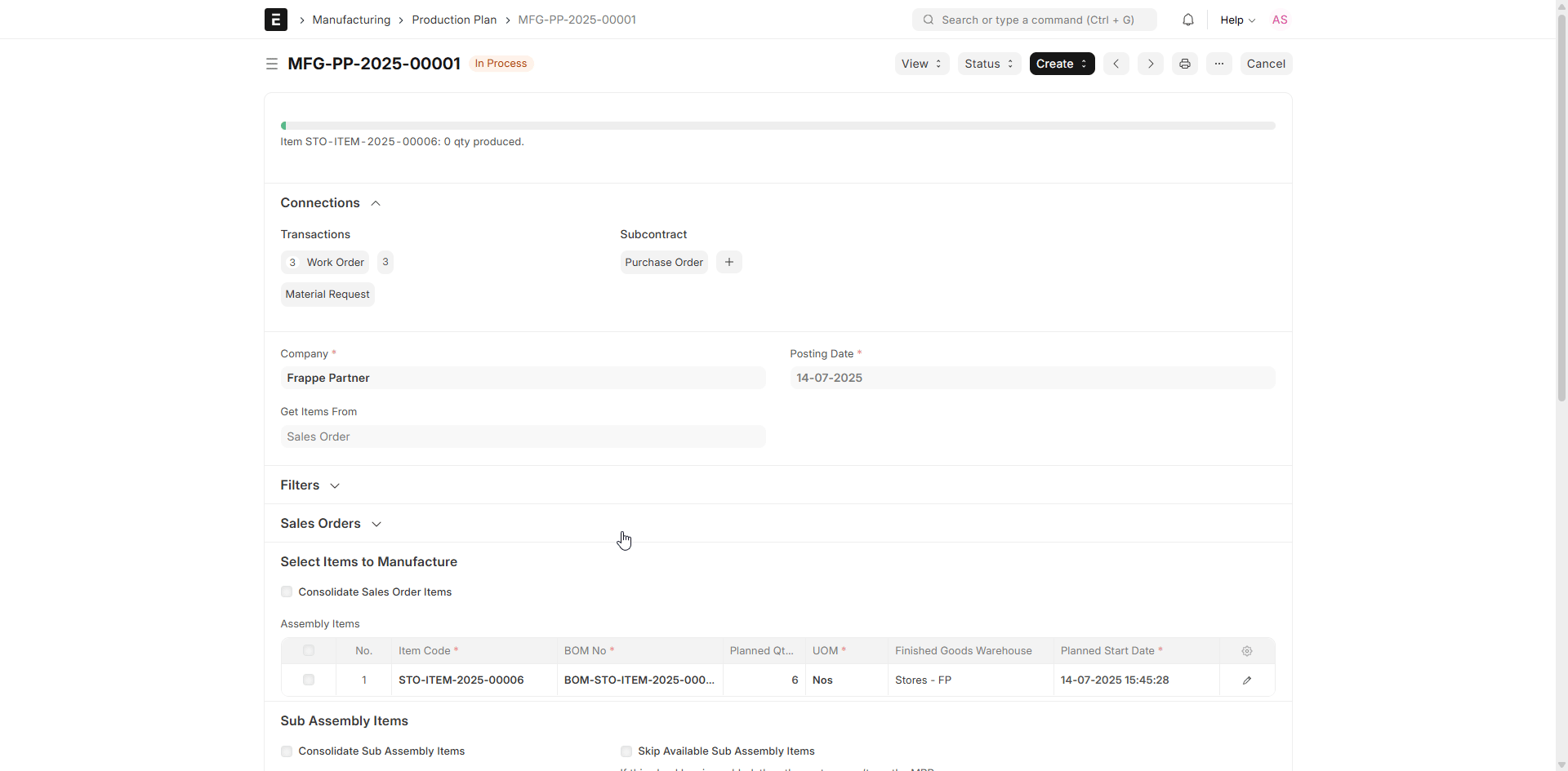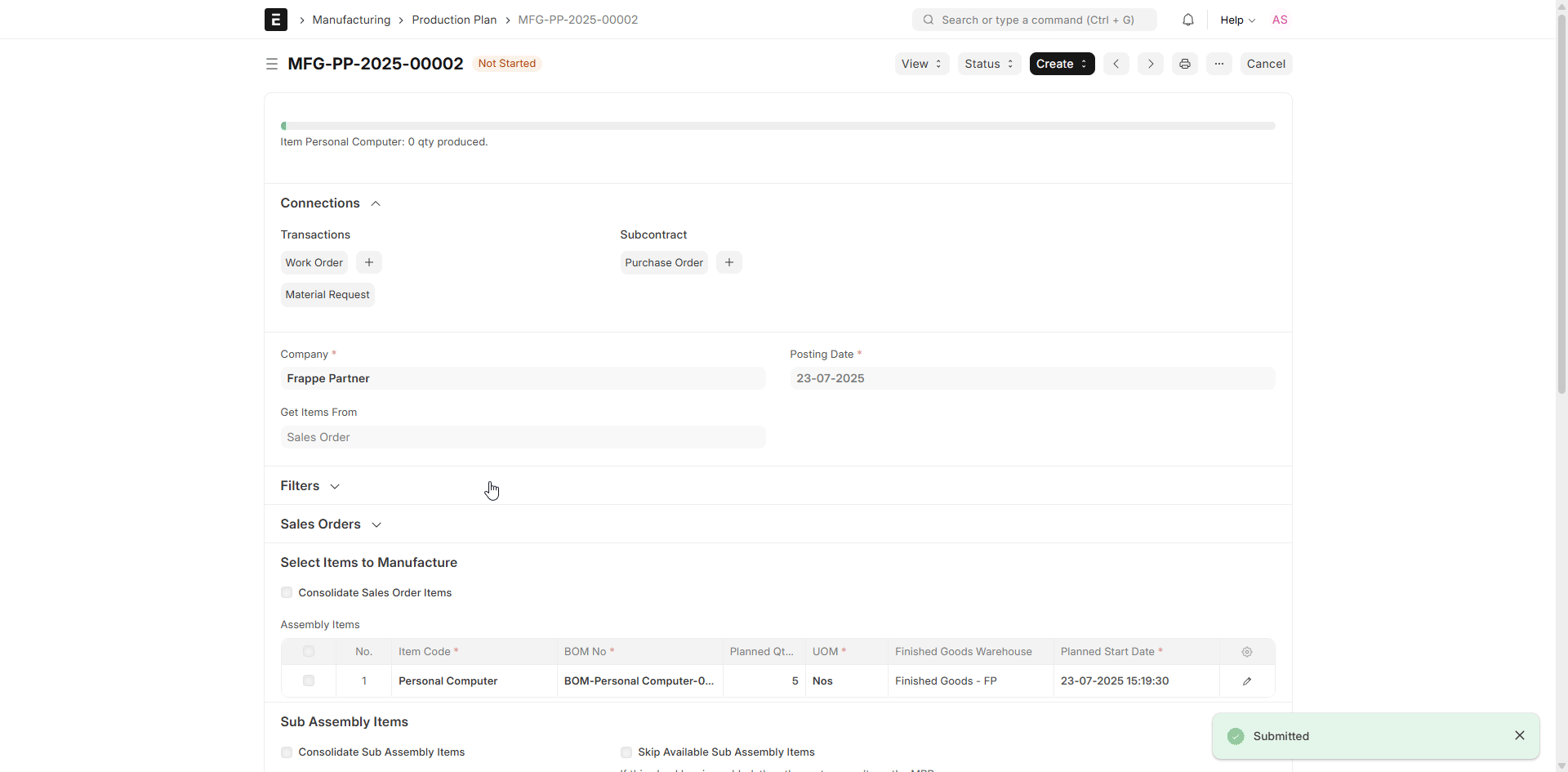 In production situations where a finished product is made up of sub-assemblies, you might need to generate Work Orders for those sub-assemblies before the final assembly. ERPNext makes this possible through the “Make Work Order for Sub Assembly Items” option in the Production Plan.