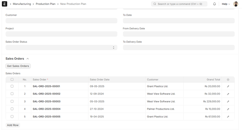 The system will display a group of filters like Customer, Sales Order, Sales Order Date, and Delivery Date, which enable you to retrieve the Sales Orders to be included in production planning.