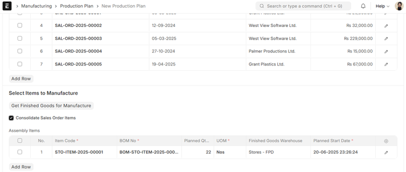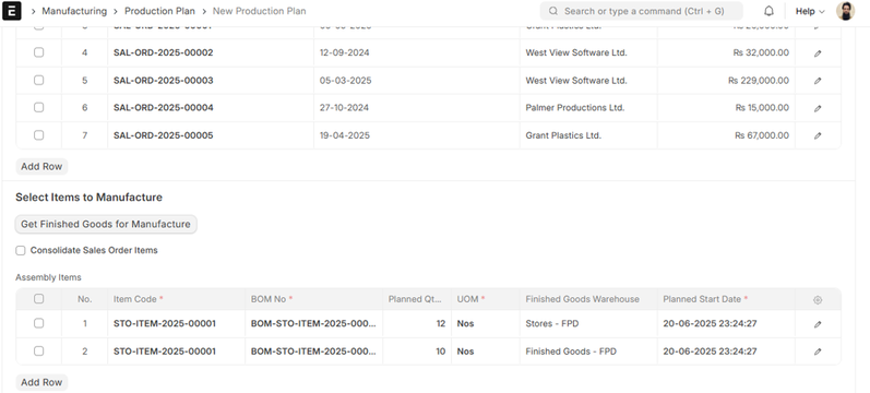 The Items to Manufacture table will now fill with valid Items retrieved from the chosen Sales Orders. Each row is one distinctive Item to produce, along with the quantity needed.