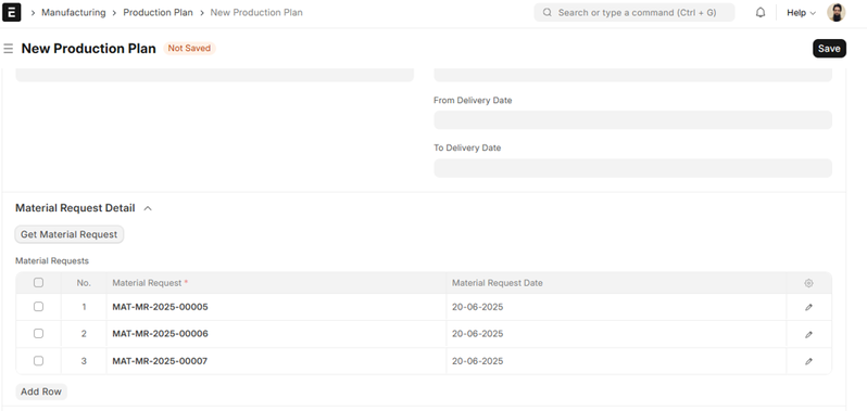 - Material Request Type: Filter by type (should be ‘Manufacture’).