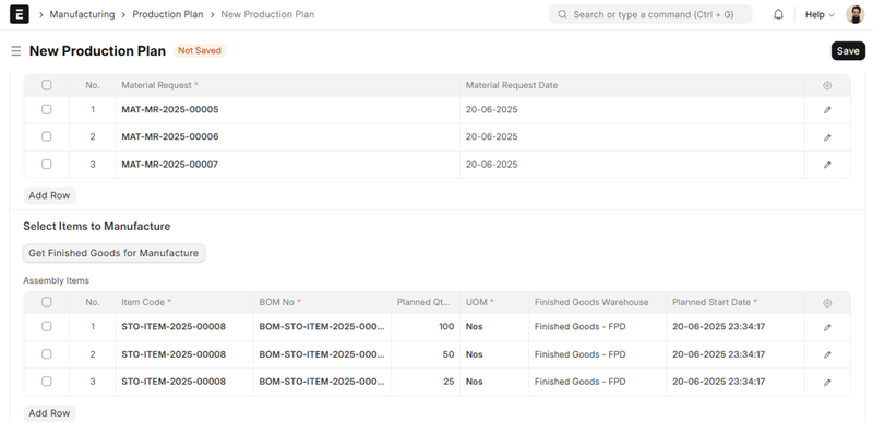 If “Consolidate Items” is checked and the plan is being saved, the system will consolidate the same items (same Item Code and BOM) from different requests into one line, and the total required quantity.