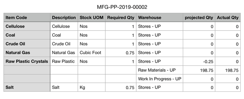 The system computes the raw material shortfall quantity after verifying the amount of available stock in the given source warehouse. For instance, to produce 200 plastic canes, if the Bill of Materials for the production is 100 plastic Nos but only 20 Nos are found in the source warehouse, it will automatically determine the shortfall and show 80 Nos in the Required Quantity column of the Material Request Plan table.