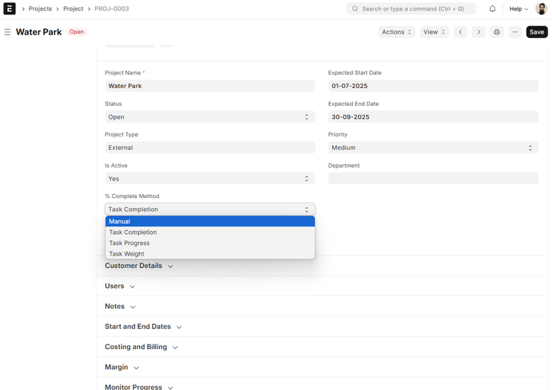 Project Type: To categorize projects (such as Internal, External, R&D) so that filtered views and reporting can be provided. Color coding of Project Type is introduced in ERPNext v15, in which a project type can be tagged by a color, thus visual management of projects can be made more approachable in List, Gantt, and Kanban.