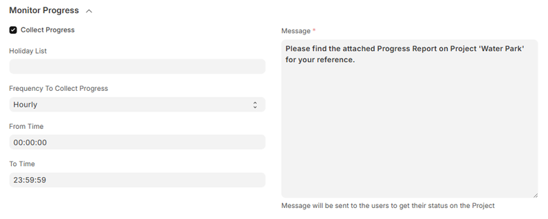 Holiday List Configuration: You can establish a Holiday List for the company or the project teams in general. This avoids progress collection and reporting from being attempted on business working days only, as designated by the Holiday List, for example, weekends or public holidays. Reporting Frequency