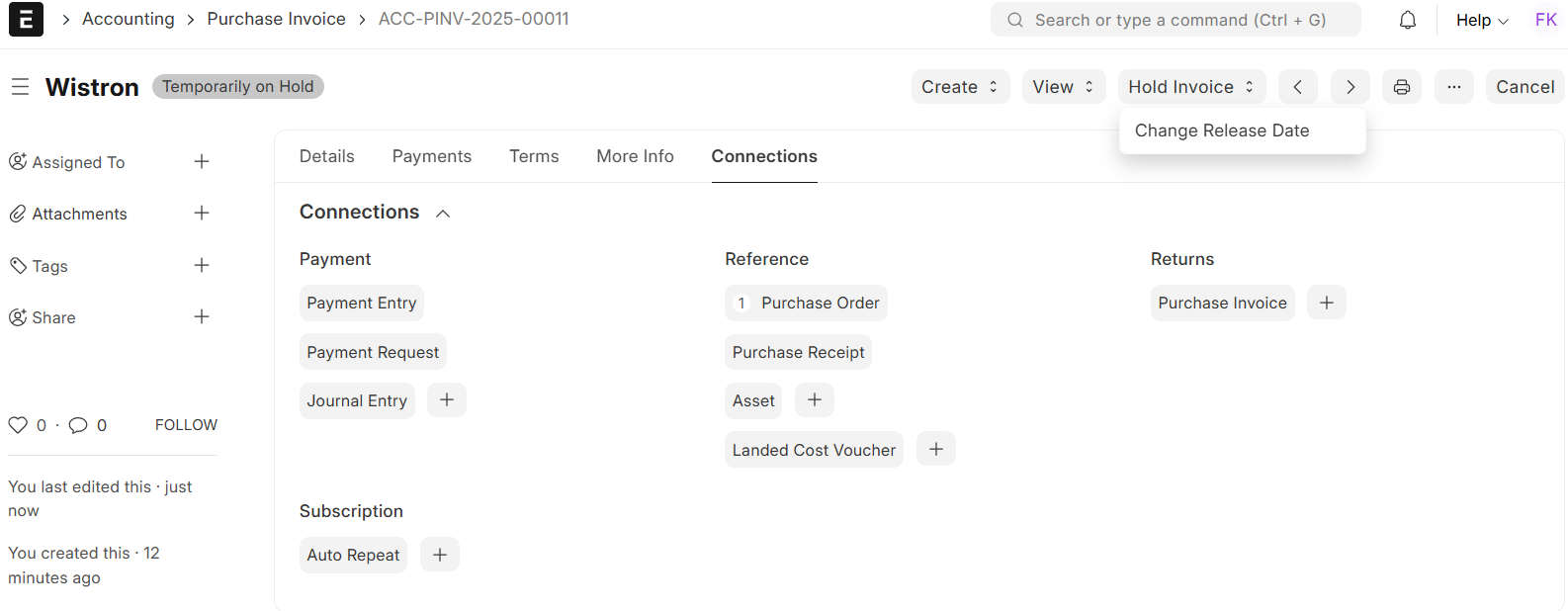 There are times when you might need to hold a Purchase Invoice temporarily, such as pending approvals, issues with quality, or internal examination. ERPNext gives you the choice of holding or blocking a purchase invoice prior to its submission and even after its submission.