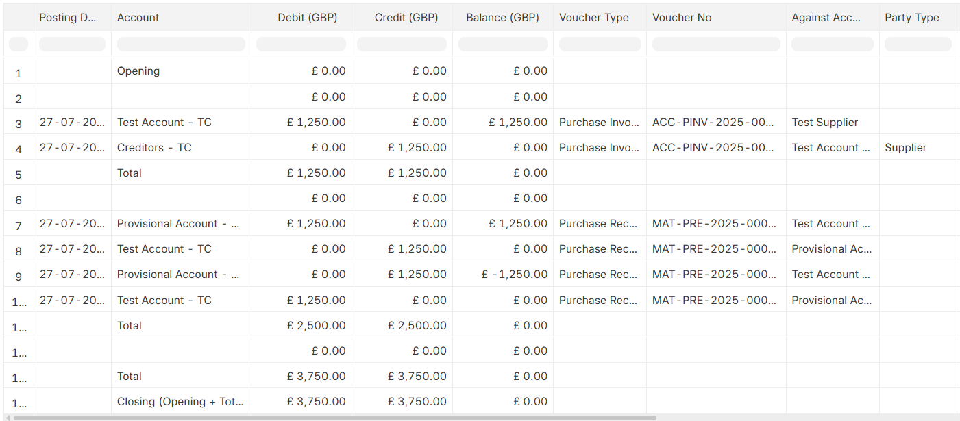 - Debits: The supplier account is credited to match the liability, which means no balance is owed.