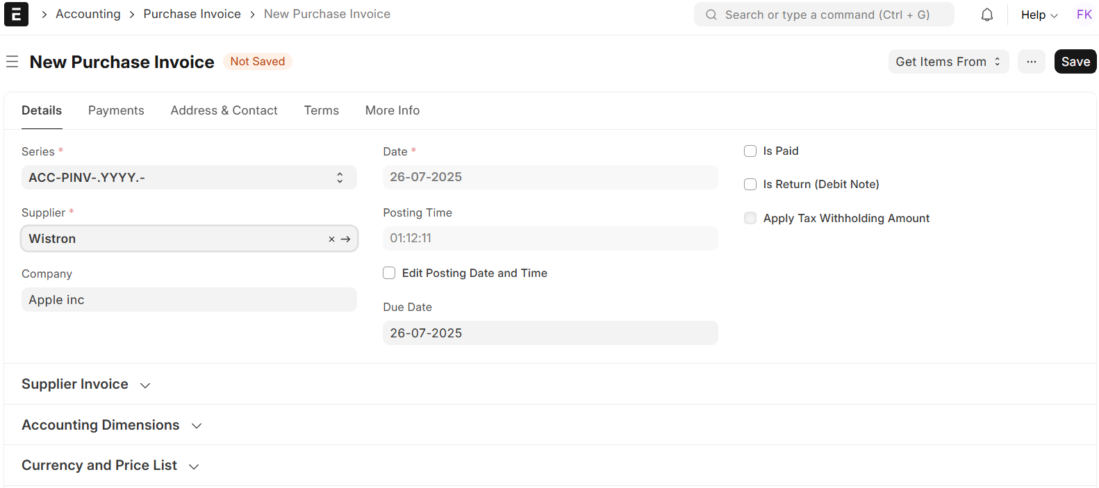 When making a purchase invoice in ERPNext, there are a few more options that offer more control and flexibility when issuing an invoice. Those options enable management of different situations such as advance payment, returns, and withholding tax.