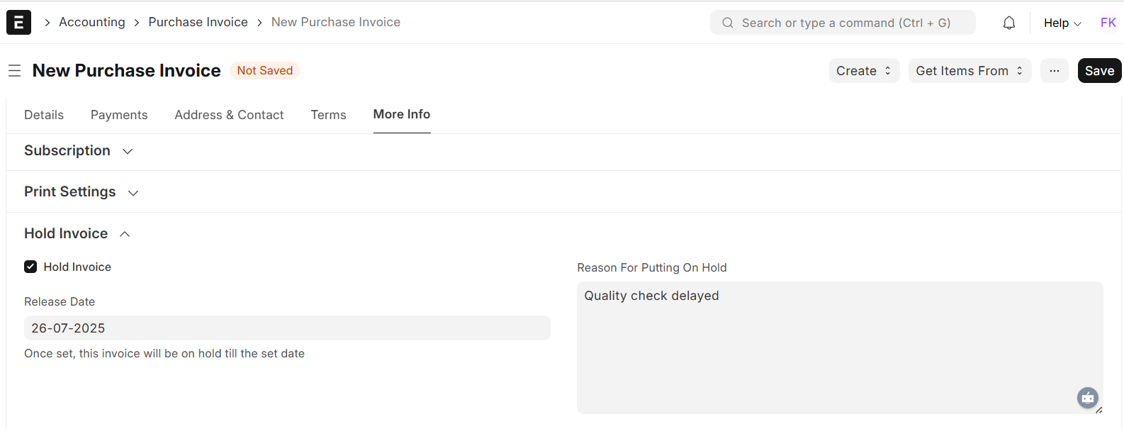 - You can select the “Hold Invoice” option on the Purchase Invoice form before submission.