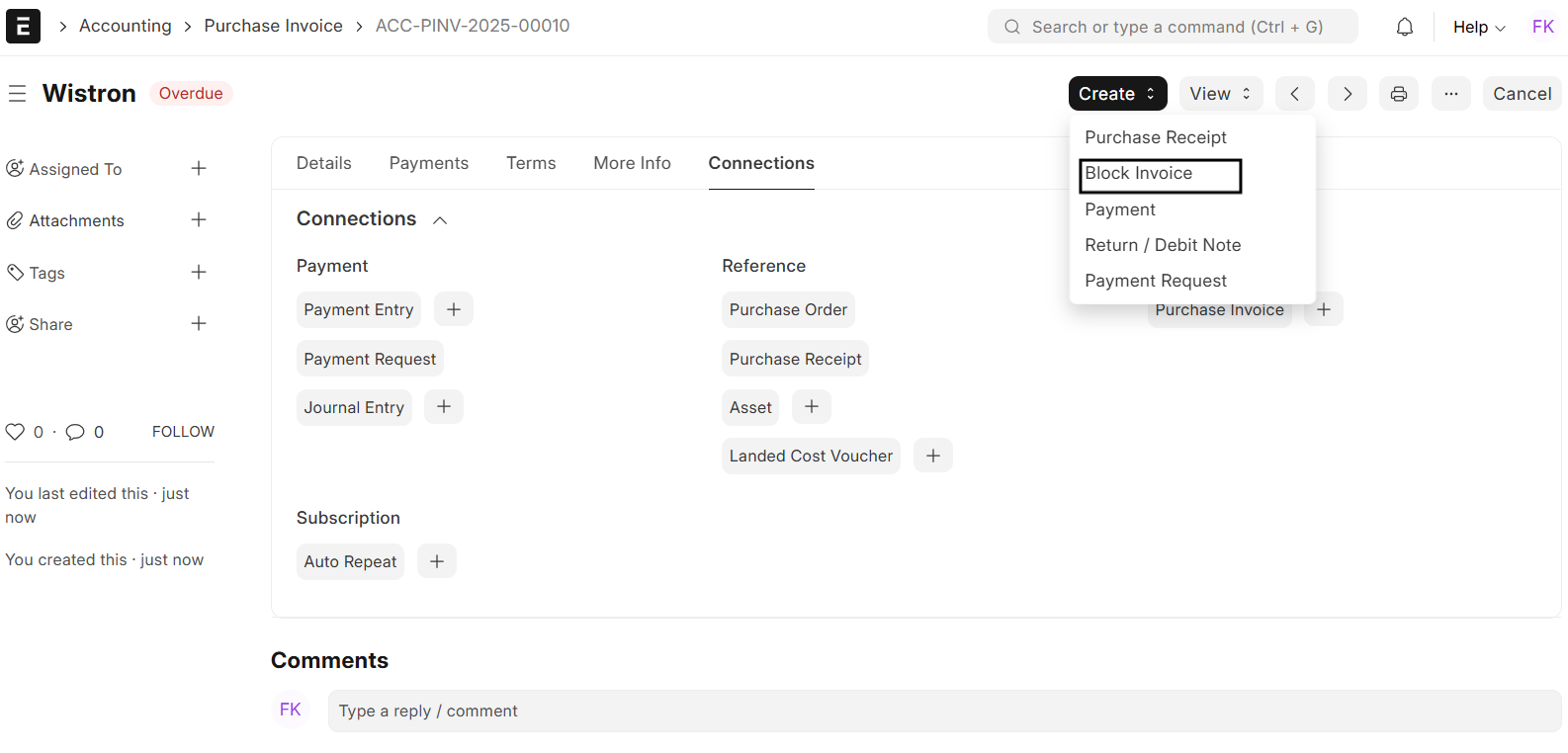 After submitting the **purchase invoice, ERPNext allows you to take several follow-up actions directly from the invoice. These actions remove manual entries and errors from the post-invoicing activities and automate them.