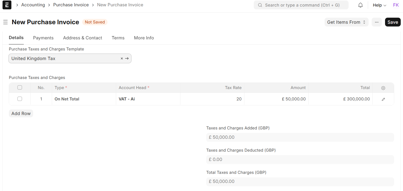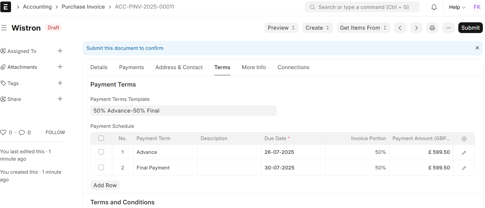 After being submitted, the purchase invoice becomes part of your accounting record, and any subsequent payment entries or accounting reports will contain this transaction.