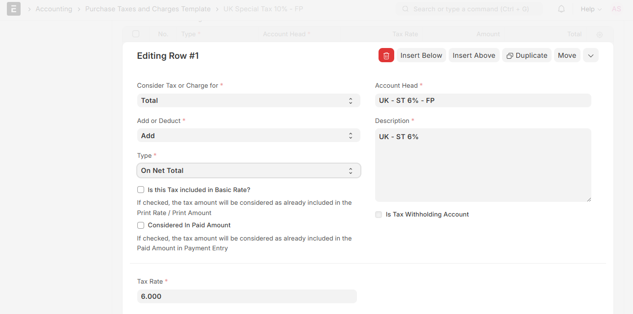 • On startup, ERPNext recognizes that the tax/charge is included in the original rate of the item.