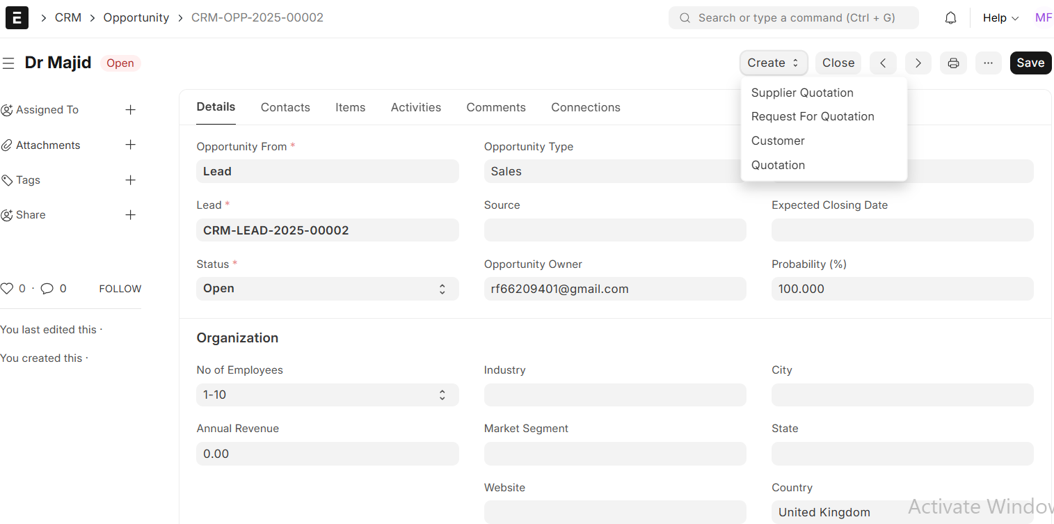 You can also create a Quotation from an Opportunity shown as follows.