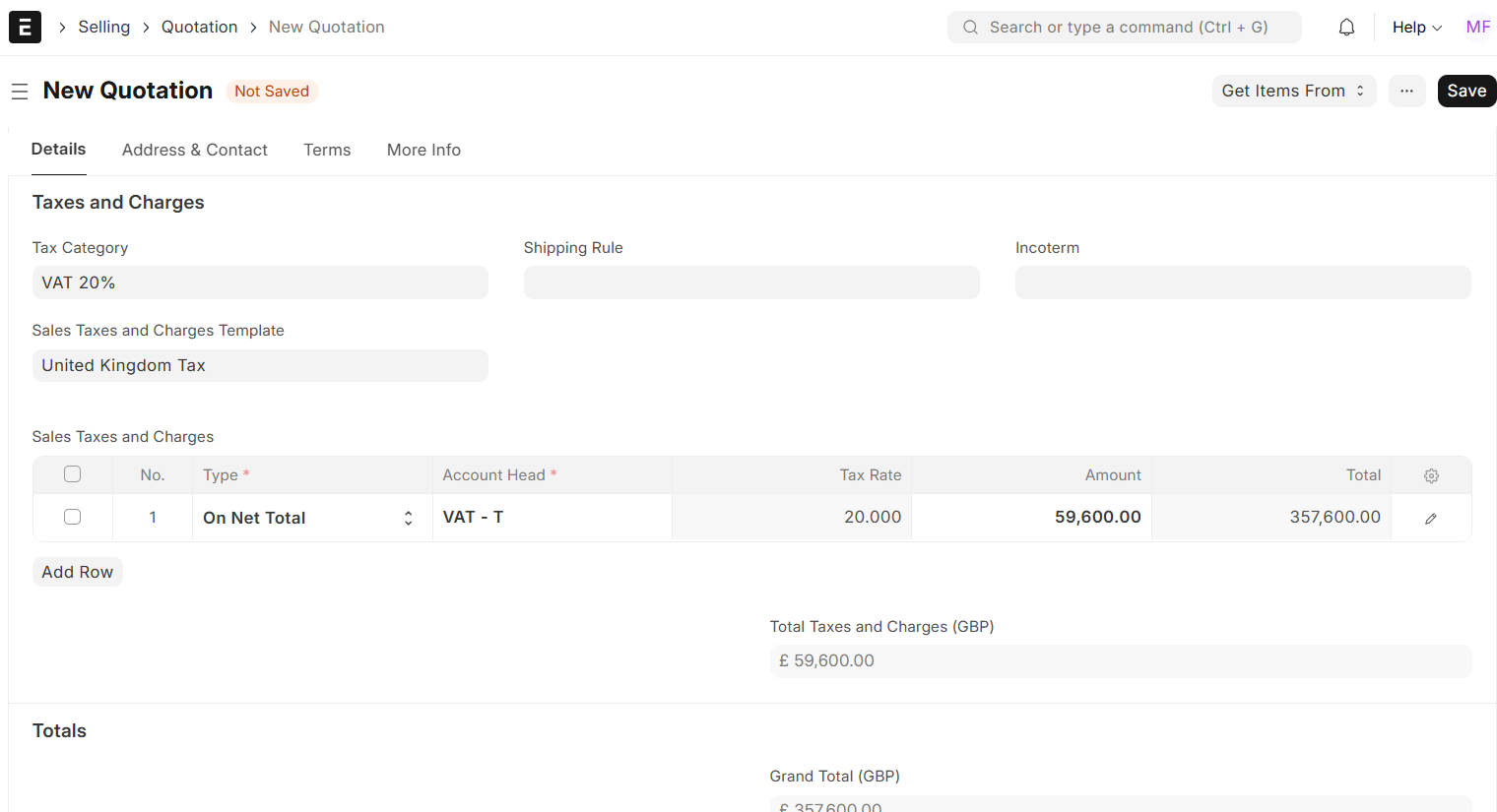 You can add taxes to your quote by either choosing a pre-set Sales Tax Charges Template or manually adding tax information in the Taxes & Charges Table. All tax amounts will automatically be updated in your document total.