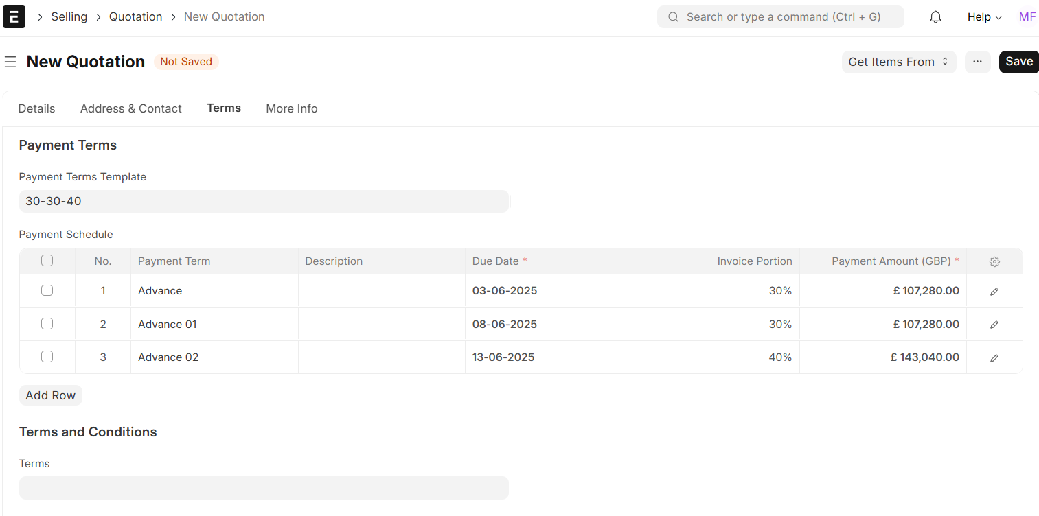 Payments can be divided into partial installments as per the agreed terms. For instance, 50% could be paid upfront as an Advance payment, with the remaining 50% payable on delivery or upon completion of service. You have the option of assigning a predefined payment terms template or manually establishing custom payment terms in this field.
