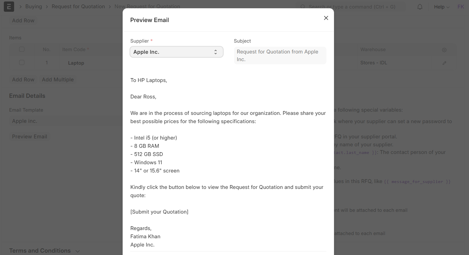 - Use the Preview Email button to see what your email will appear as to a specific supplier before you send it. This ensures that communication is professional and unambiguous.