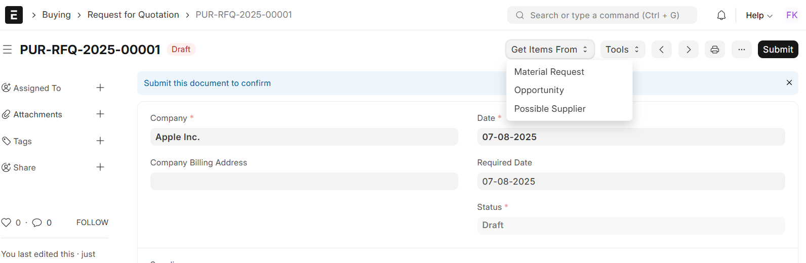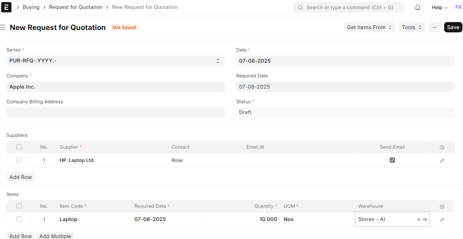 - When ready to proceed, submit the Request for Quotation. ERPNext will then automatically send an email to all suppliers listed if the “Send Email” option is enabled for them.