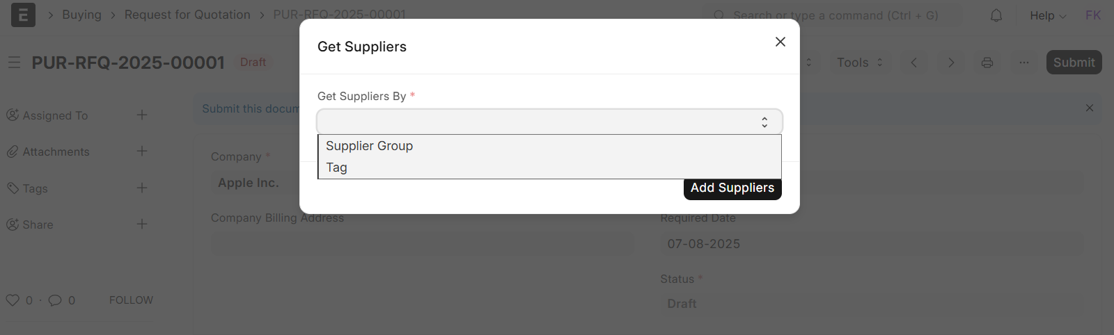 - ERPNext will retrieve all the suppliers from the selected group and add them to the RFQ.
