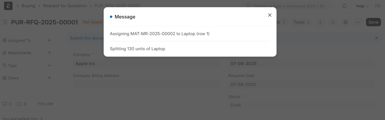 - ERPNext will create a Supplier Quotation document in Draft status in your system automatically.