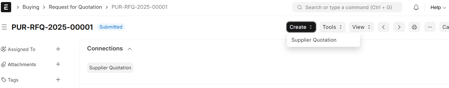 Upon submission, ERPNext will create a Supplier Quotation (draft mode) against the Supplier: