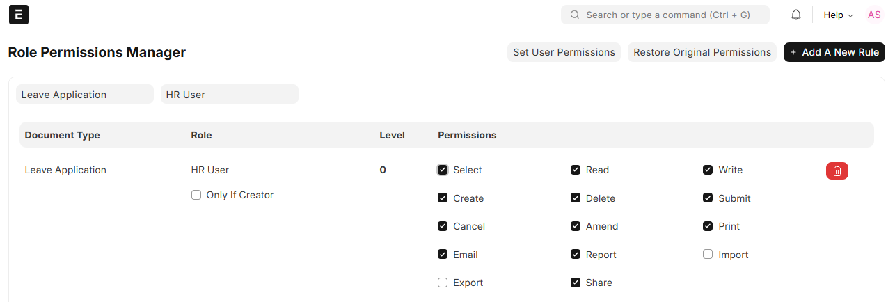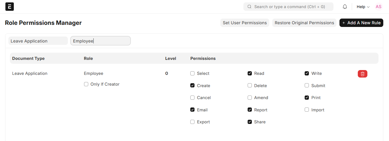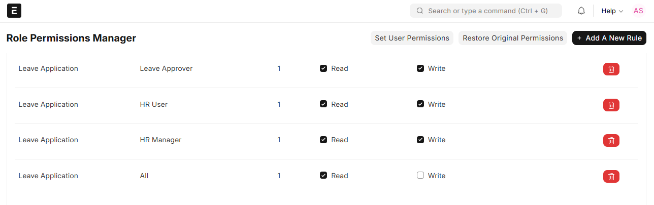 The Leave Application is an excellent example that highlights how role-based permissions, user permissions, and permission levels interact with each other.