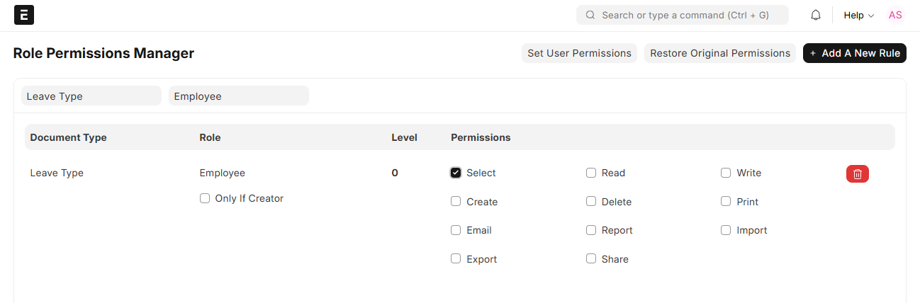 - A HR User can specify or update User Permissions on the Leave Application DocType for others so that there is controlled delegation of access without the need for administrator intervention.