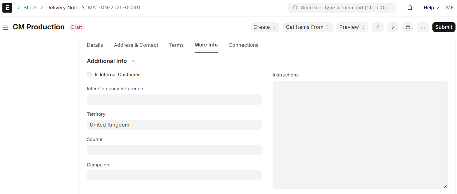 • When the “Update Stock” box is checked, any stock adjustments will occur automatically, and a separate Delivery Note will not be created.
